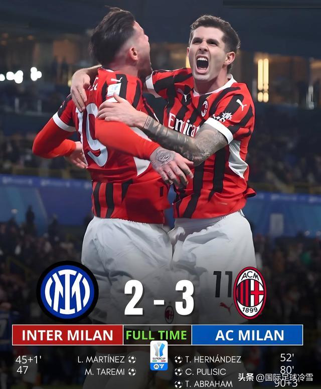 意超杯决赛,国米凭借劳塔罗、塔雷米的进球一度2-0领先AC米兰,但随后被红黑军上演“让二追三”的大戏,AC米兰3-2逆转捧杯。